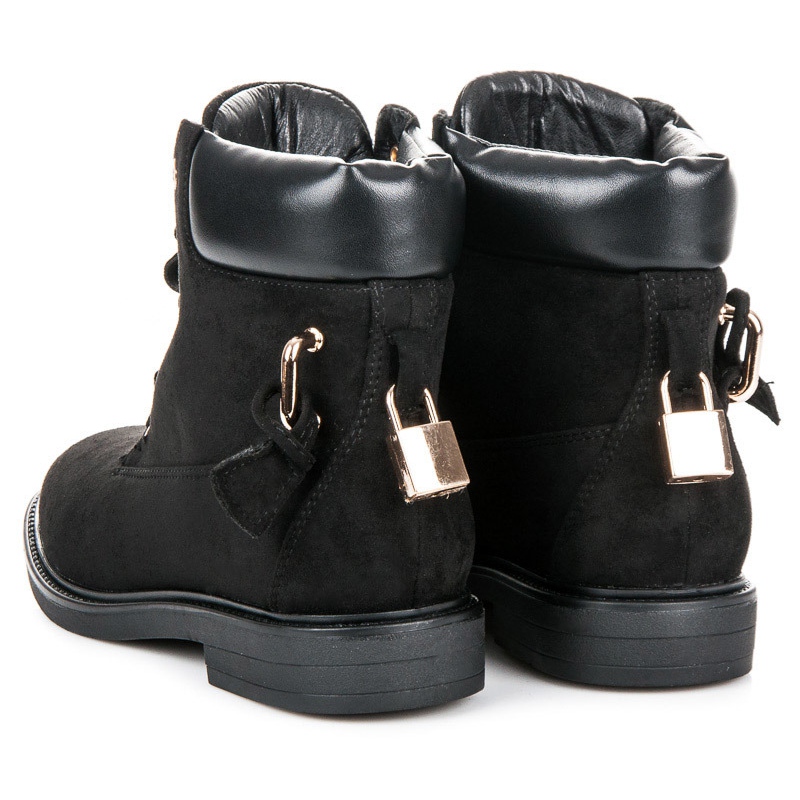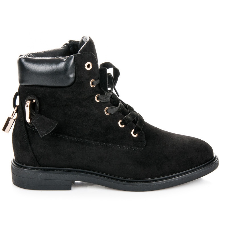 Un élément caractéristique des chaussures est un cadenas décoratif accroché à l'arrière, qui ajoute un style unique et attire l'attention. La fermeture à lacets permet un ajustement facile au pied. Un bout rond et un talon renforcé intégré augmentent le confort d'utilisation, et la semelle à bande de roulement en plastique assure une bonne adhérence sur diverses surfaces.