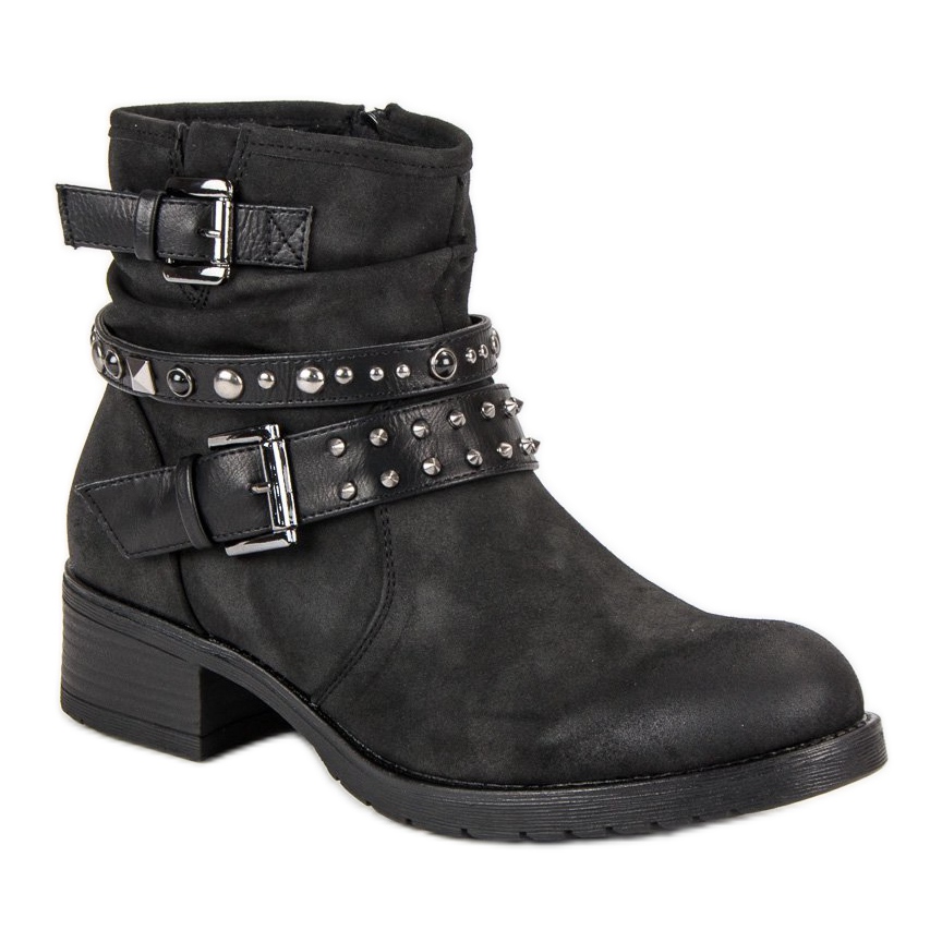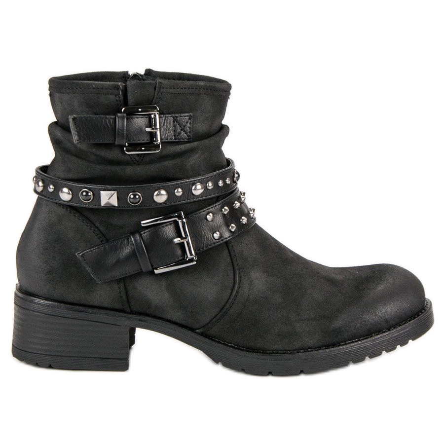 Les ouvriers noirs VINCEZA sont un choix parfait pour toute femme courageuse qui veut se démarquer de la foule. Ces bottes élégantes, fabriquées en cuir écologique de haute qualité, allient élégance et design tendance. Leurs boucles décoratives caractéristiques et leurs détails en forme de strass et de clous leur confèrent un caractère rock et unique, s'adaptant parfaitement au style décontracté.