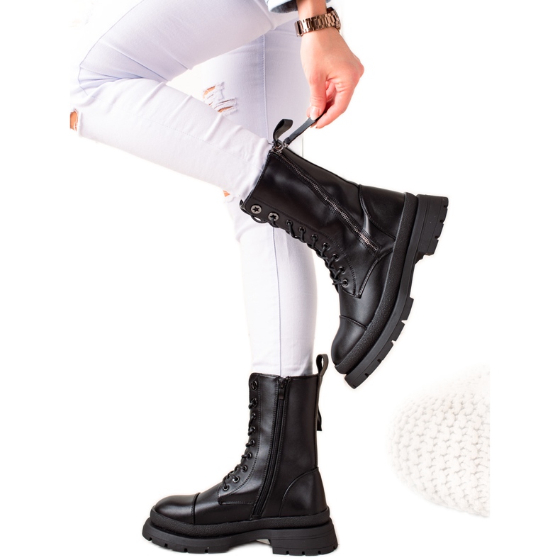 Les bottes de travail noires se distinguent également par une fermeture éclair décorative, qui leur donne un look moderne. La fermeture éclair et le système de laçage permettent un ajustement parfait au pied, ce qui est crucial pour le confort de port.