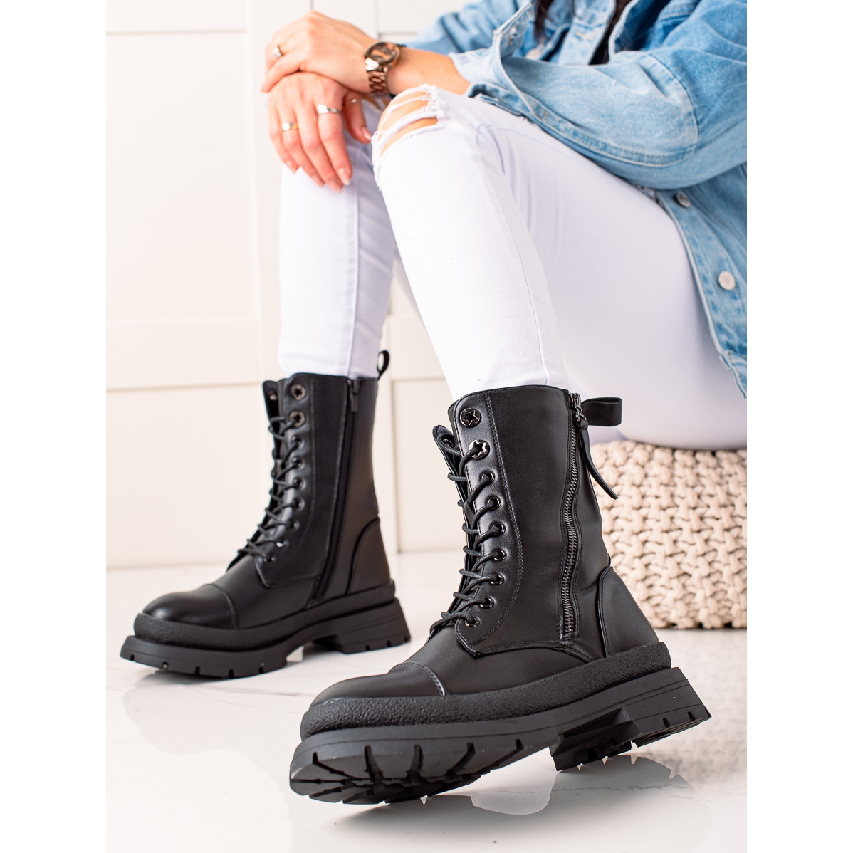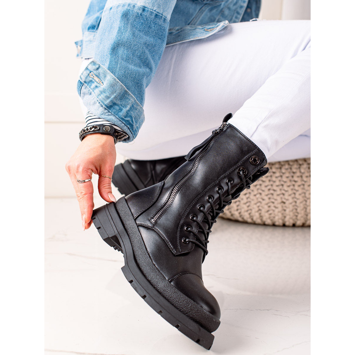 Le modèle est fabriqué en cuir écologique de haute qualité, ce qui le rend à la fois respectueux de l'environnement et durable et facile à entretenir. La tige souple et fermée d'une hauteur de 19 cm et le bout rond offrent confort et maintien du pied, et l'isolation garde vos pieds au chaud même les jours les plus froids.
