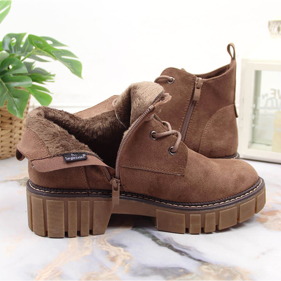 Ces bottines extrêmement élégantes se distinguent par une teinte marron chaude, qui s'intègre parfaitement dans les tendances automnales et hivernales. Fabriqués en cuir suédé écologique, ils représentent non seulement une excellente qualité, mais aussi un design moderne qui ajoutera du caractère à n'importe quel style. L'intérieur isolé avec fourrure et une semelle intérieure confortable offrent une excellente chaleur et un excellent confort, même par temps froid.