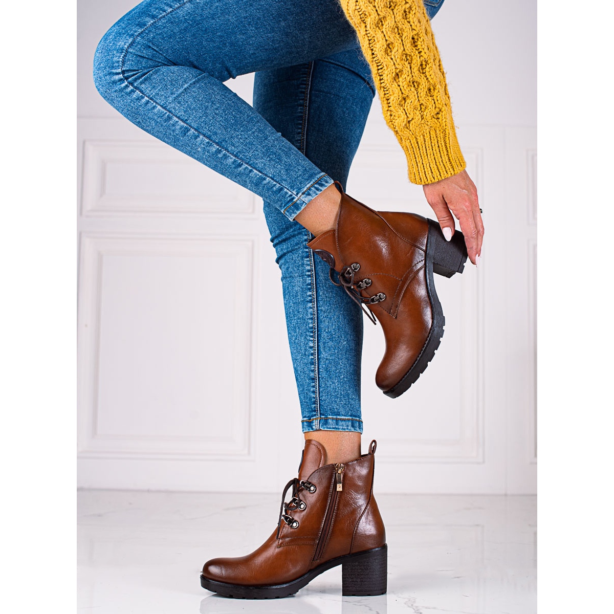 La tige est en cuir écologique de haute qualité et la semelle en plastique avec bande de roulement assure une bonne adhérence sur diverses surfaces. Un talon haut de 6 cm sur bloc ajoute de l'élégance, et une plateforme de 2 cm augmente le confort de port. Les fermetures à glissière et les détails à lacets ajoutent du caractère et permettent un ajustement individuel.