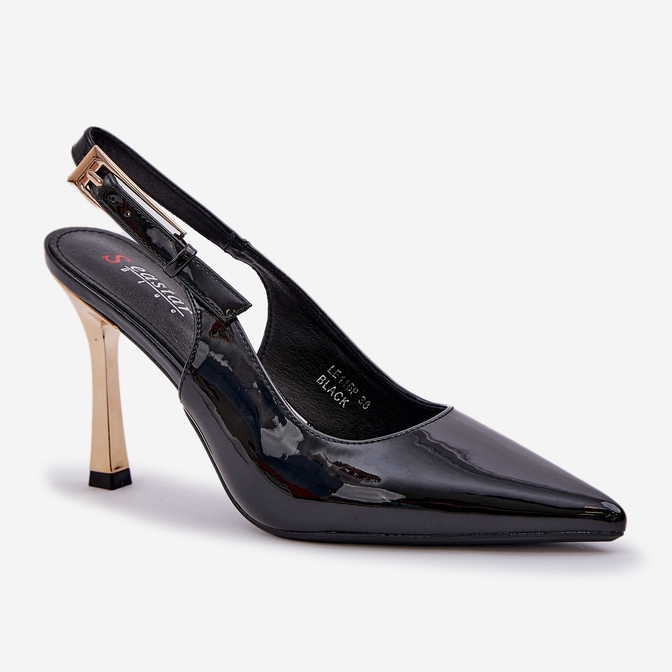 Détails: Verni les talons hauts avec un talon ouvert et des orteils pointés le noir
