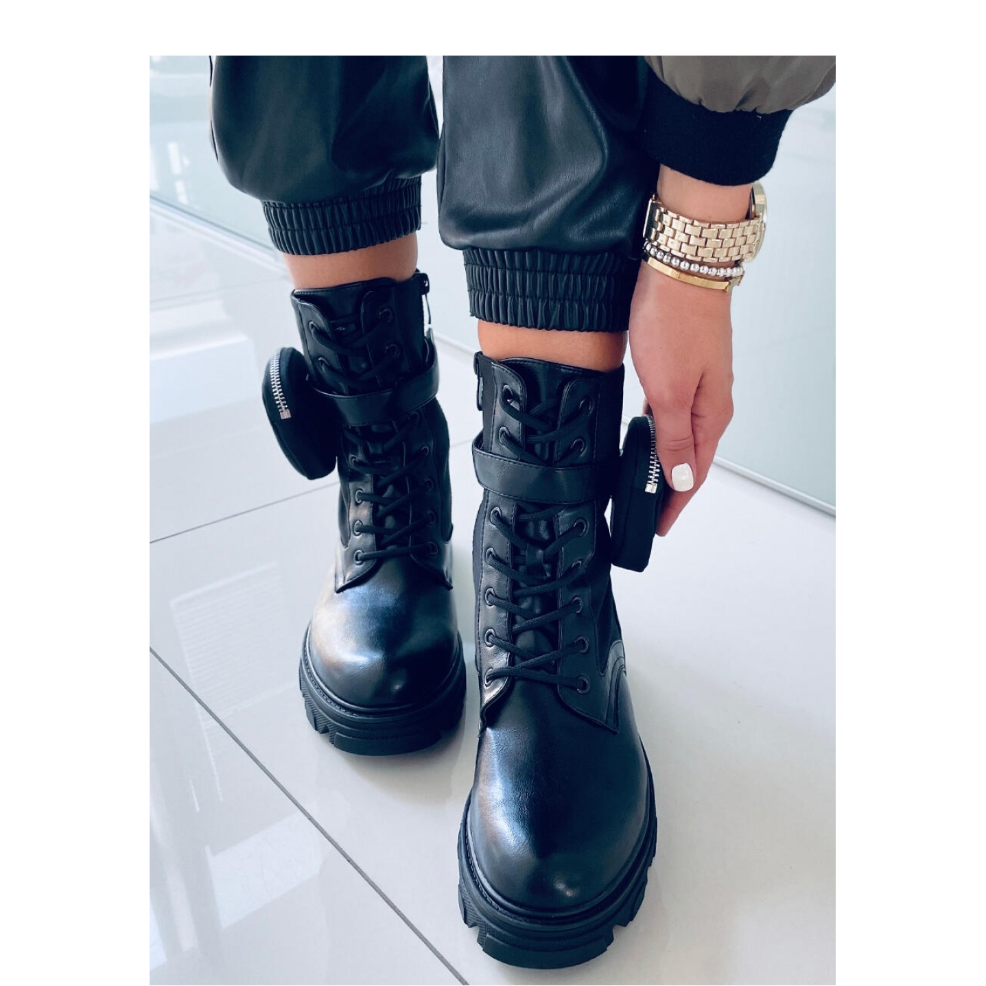 Les bottes noires Victor sont faites de cuir écologique de haute qualité et de tissu néoprène élastique, ce qui assure un excellent confort et durabilité. De plus, le réchauffeur interne en fourrure délicat rend vos pieds chauds même les jours plus frais. De plus, une pochette détachable leur donne un caractère et une fonctionnalité uniques - parfaits pour les petites choses!