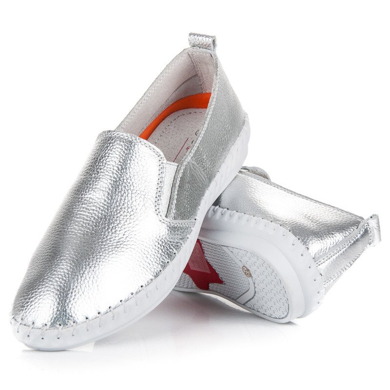 Les slipons argentés VINCEZA gris sont un choix parfait pour les femmes qui souhaitent ajouter un peu d'extravagance à leur style. Ces chaussures à la mode ont une apparence inhabituelle qui attirera certainement l'attention. Fabriqués en cuir naturel de haute qualité, ils garantissent non seulement une durabilité, mais aussi un confort de port exceptionnel. Leur faible hauteur et leur bout rond les rendent parfaites à porter au quotidien.