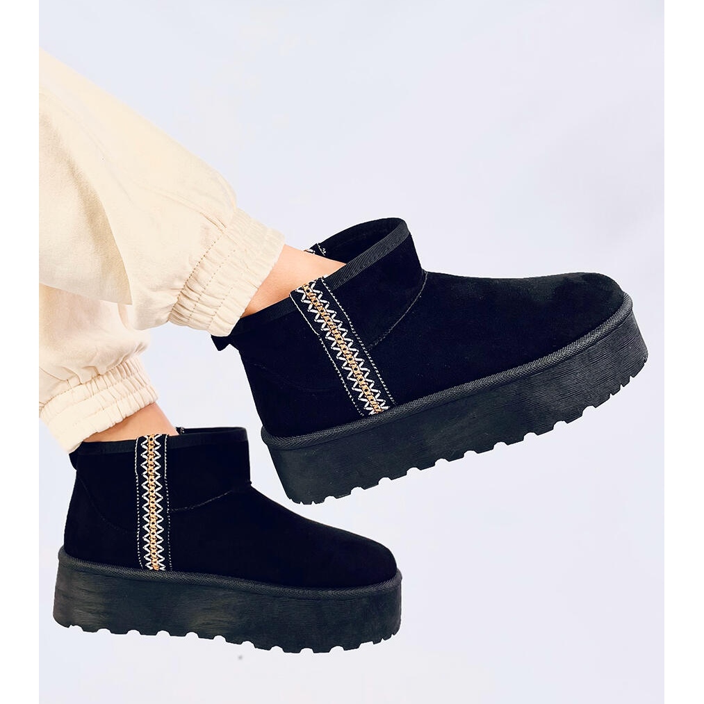 Les bottes de neige courtes sur la plate-forme Black Weyan sont un excellent choix pour les jours d'hiver qui combinent le design à la mode et la praticité. Ces émeus uniques avec le motif aztèques sont parfaits pour les jours froids, garantissant une chaleur et un confort maximaux. Leur intérieur est rembourré d'une fourrure moelleuse et épaisse qui enroule vos pieds, et une plate-forme plate d'une hauteur de 5 cm garantit une grande isolation à partir d'un sol froid.