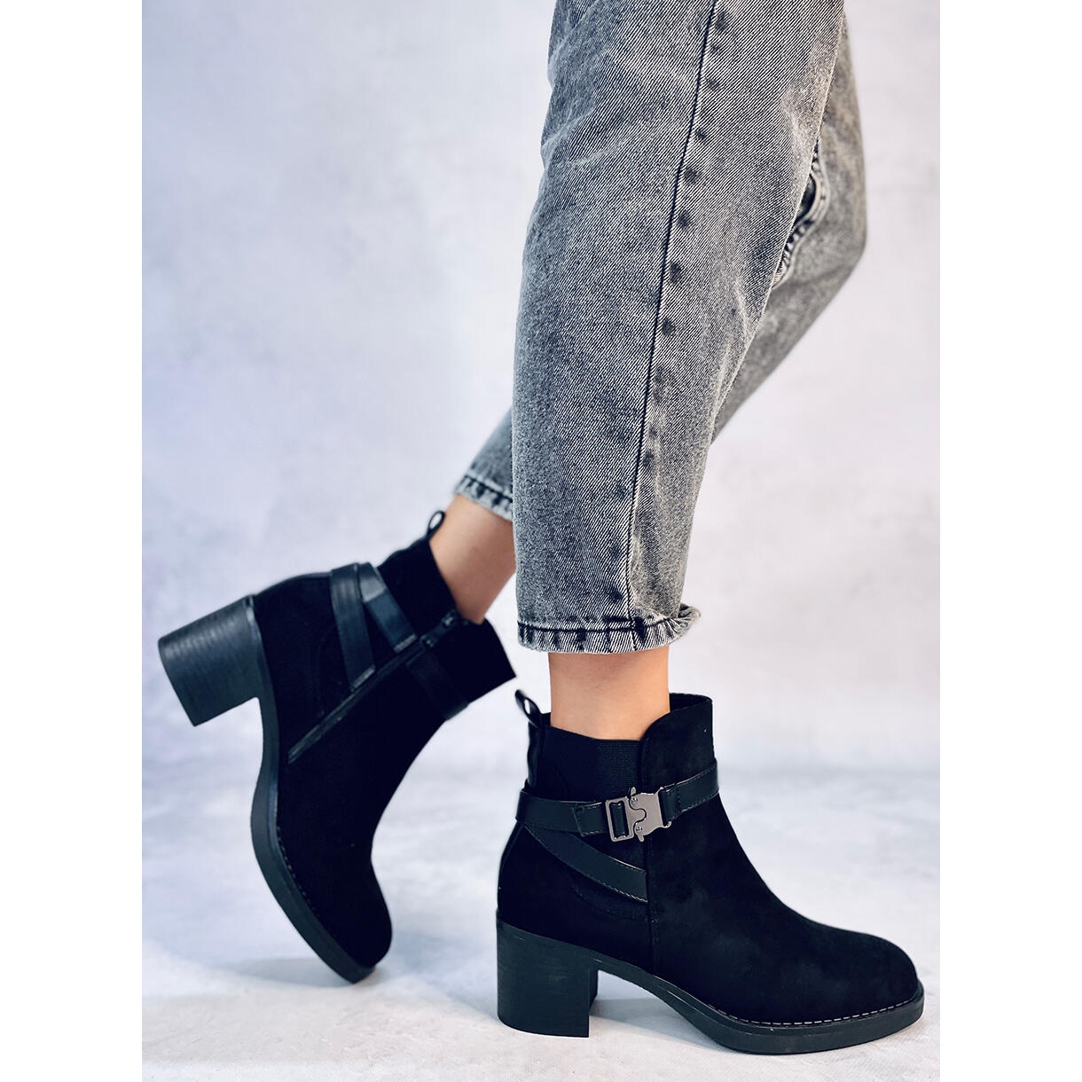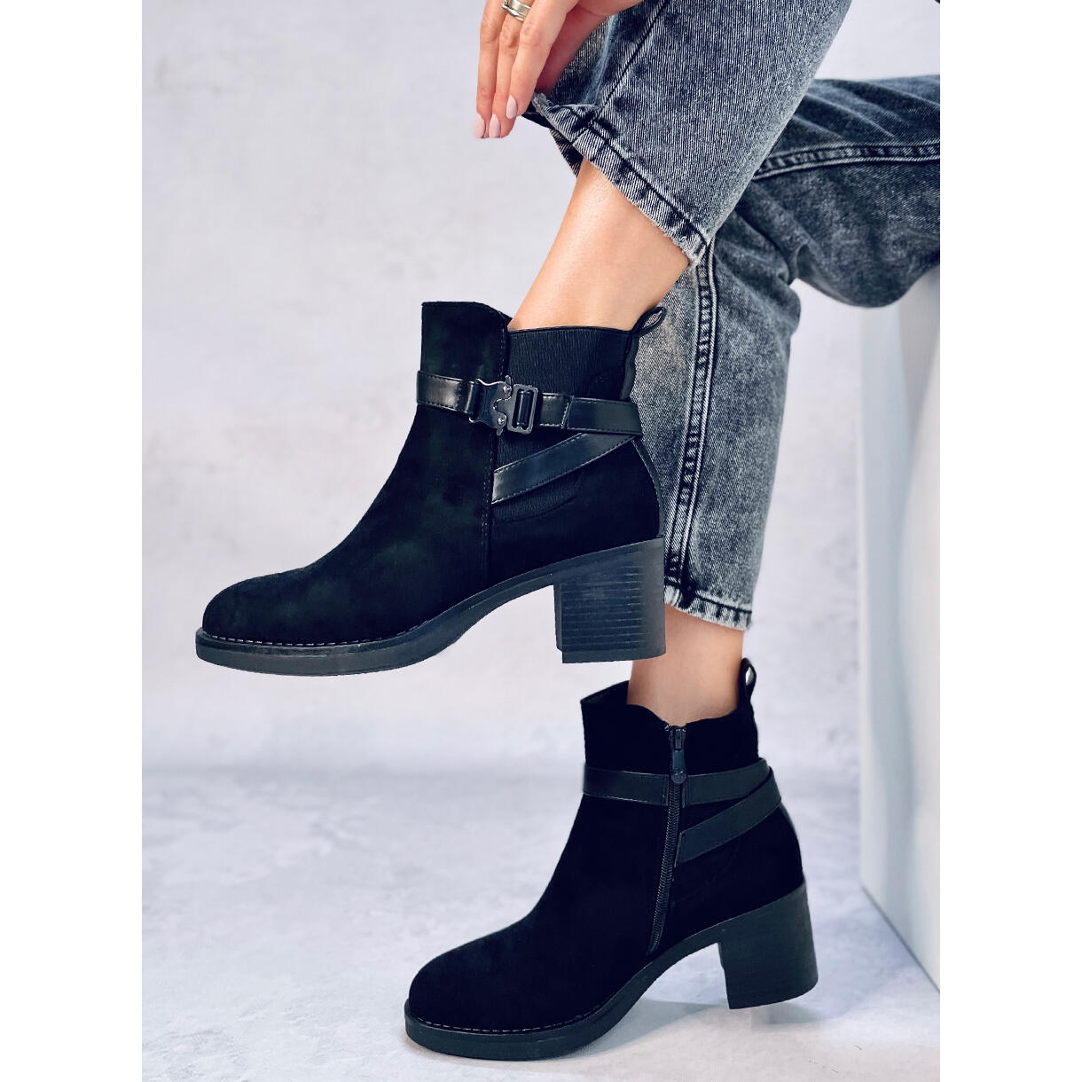 Le produit décrit ci-dessous sont des bottines pour femmes qui allient confort et style classique et simple. Elles s'appellent « Bottines à talon stable Yonda Black » et sont de couleur noire. Elles sont fabriquées en daim écologique et doublées de fourrure douce, ce qui en fait des chaussures chaudes et confortables pour les journées les plus froides. Les bottes ont un talon large de 6 cm de haut, qui assure stabilité et confort de port.