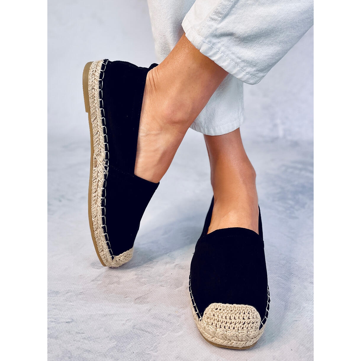 Le produit est des espadrilles pour femmes, conçues pour un usage quotidien. Les chaussures sont noires et lisses, sans motif dominant. Ce modèle se caractérise par un bout rond et un talon plat d'une hauteur de 1,5 cm, qui assure un confort de port.