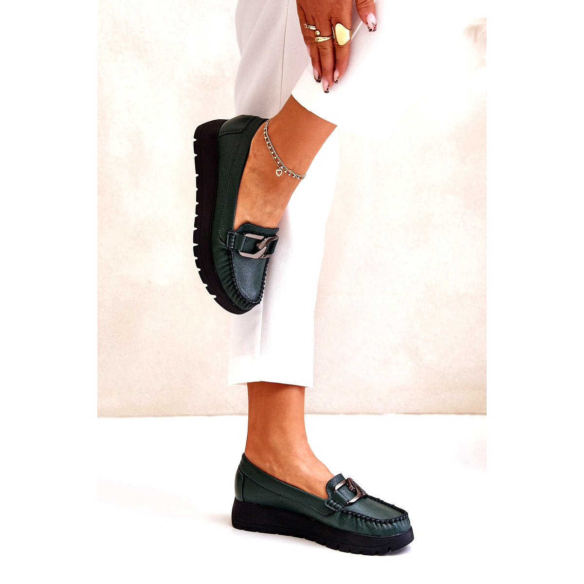 Détails: Zazoo 10141 Mocassins en cuir sur plateforme avec décoration, vert foncé