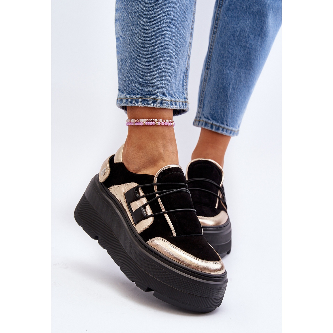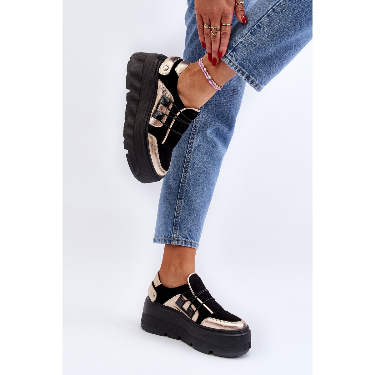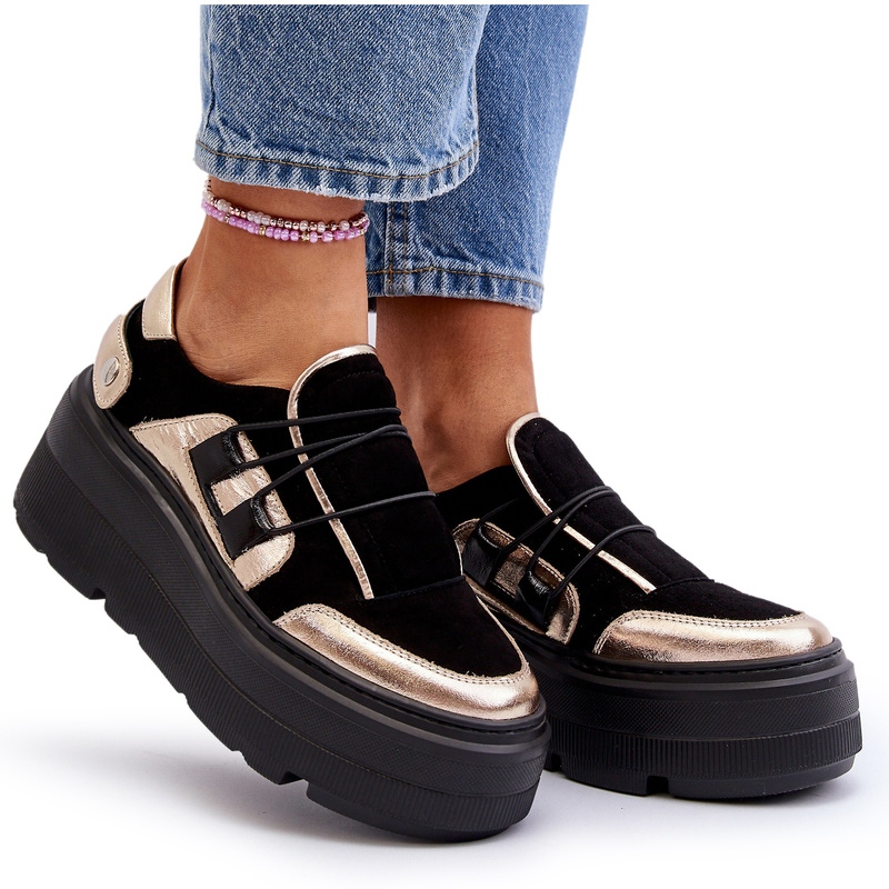 Les baskets noires avec des accents métalliques en or correspondront parfaitement aux différentes stylisations, leur donnant un style sportif. Parfait pour les combinaisons décontractées et plus élégantes, ce qui en fait un ajout universel dans chaque garde-robe. Grâce à la semelle intérieure en cuir, vous vous sentirez réconfortant à chaque étape, et leur design inséré facilitera la mise en place quotidienne.