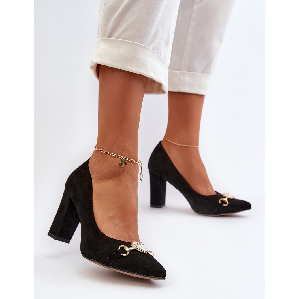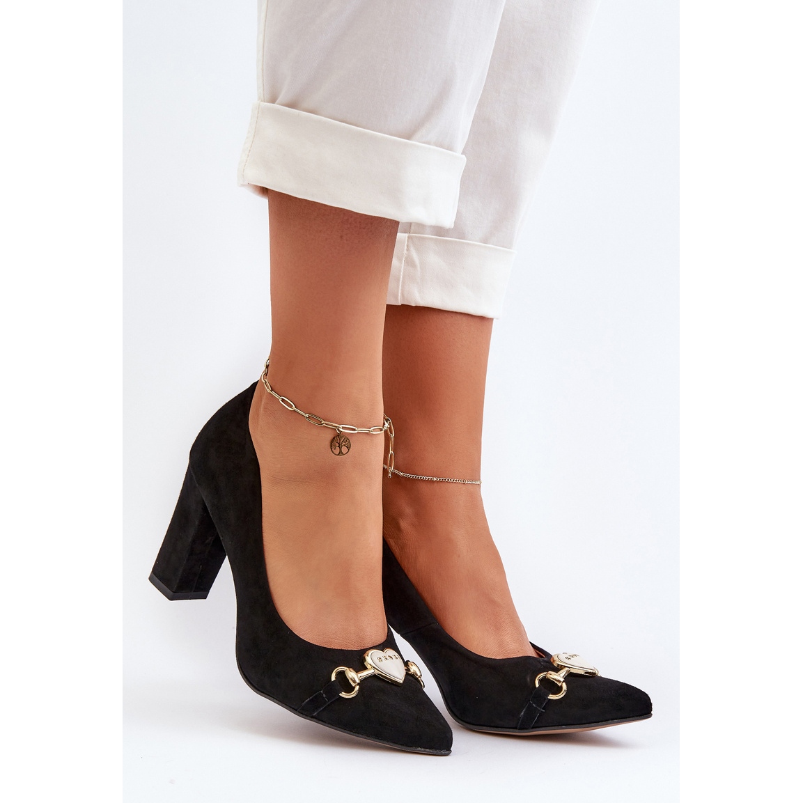 Les avantages de ces escarpins incluent également la chaîne, un accessoire élégant, subtil, mais qui en même temps complète efficacement l'ensemble. Leur design noir et élégant en fait un choix universel, s'adaptant à de nombreux styles, du travail au soir. La surface en daim et en cuir s'harmonise avec n'importe quel matériau, ajoutant une élégance classique à n'importe quel ensemble.