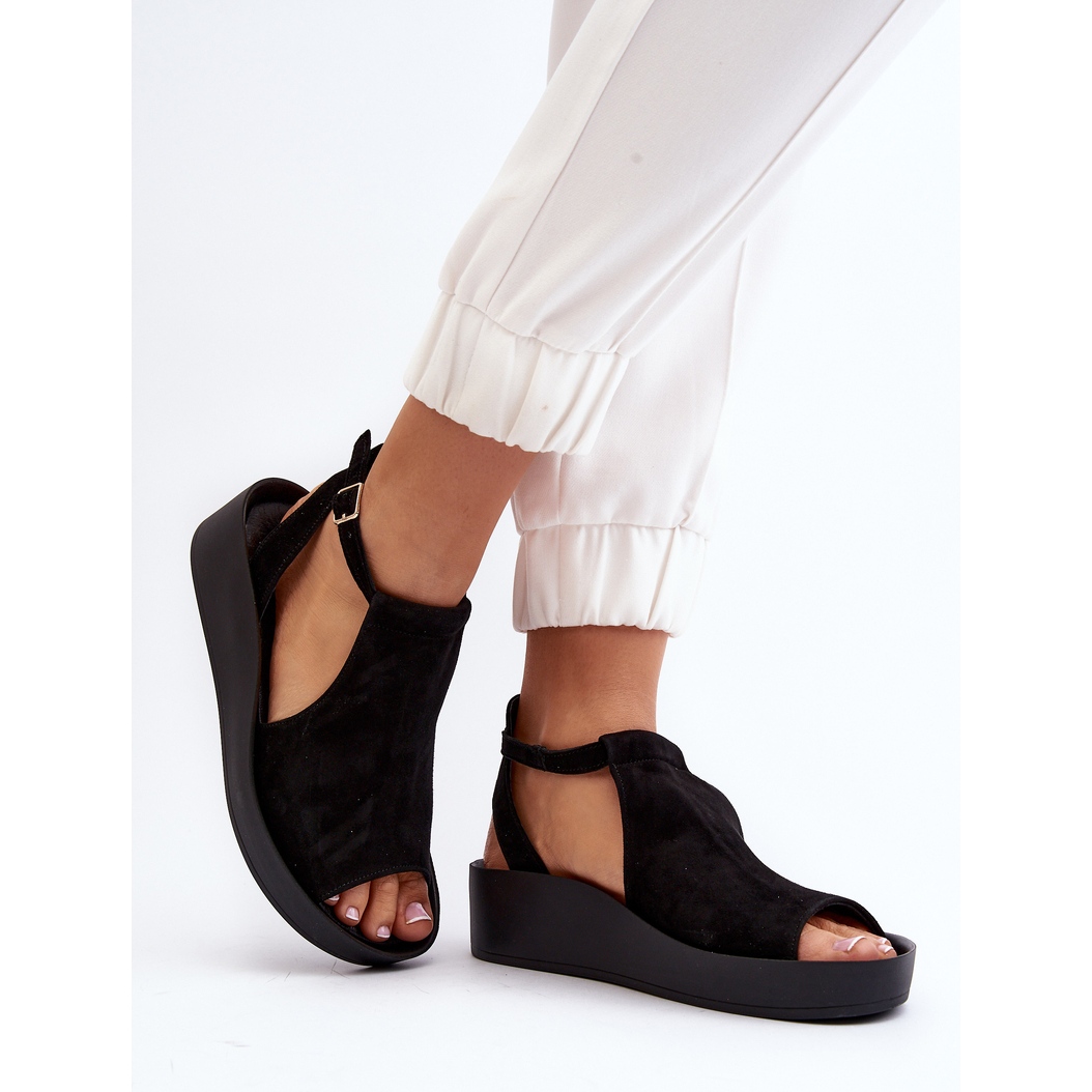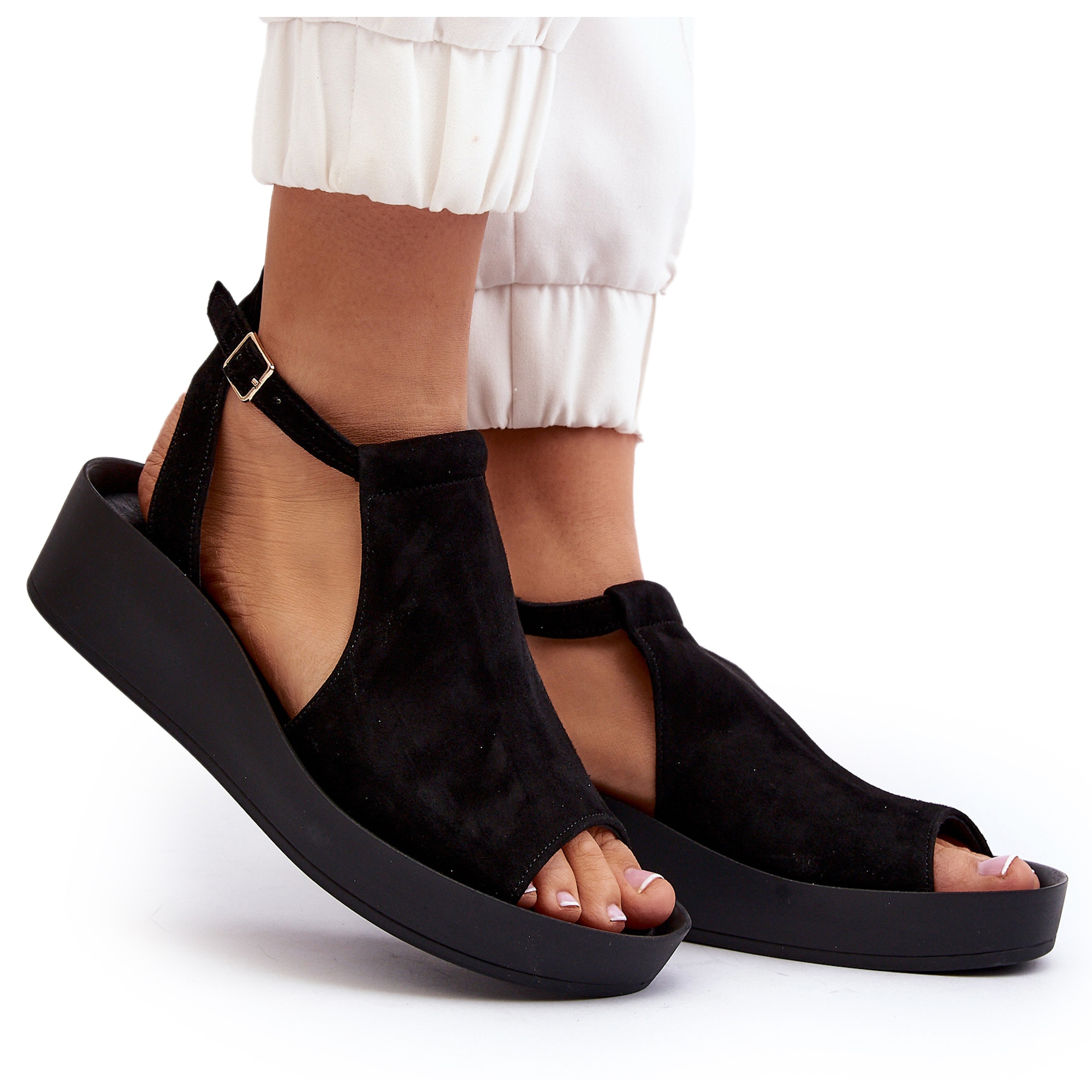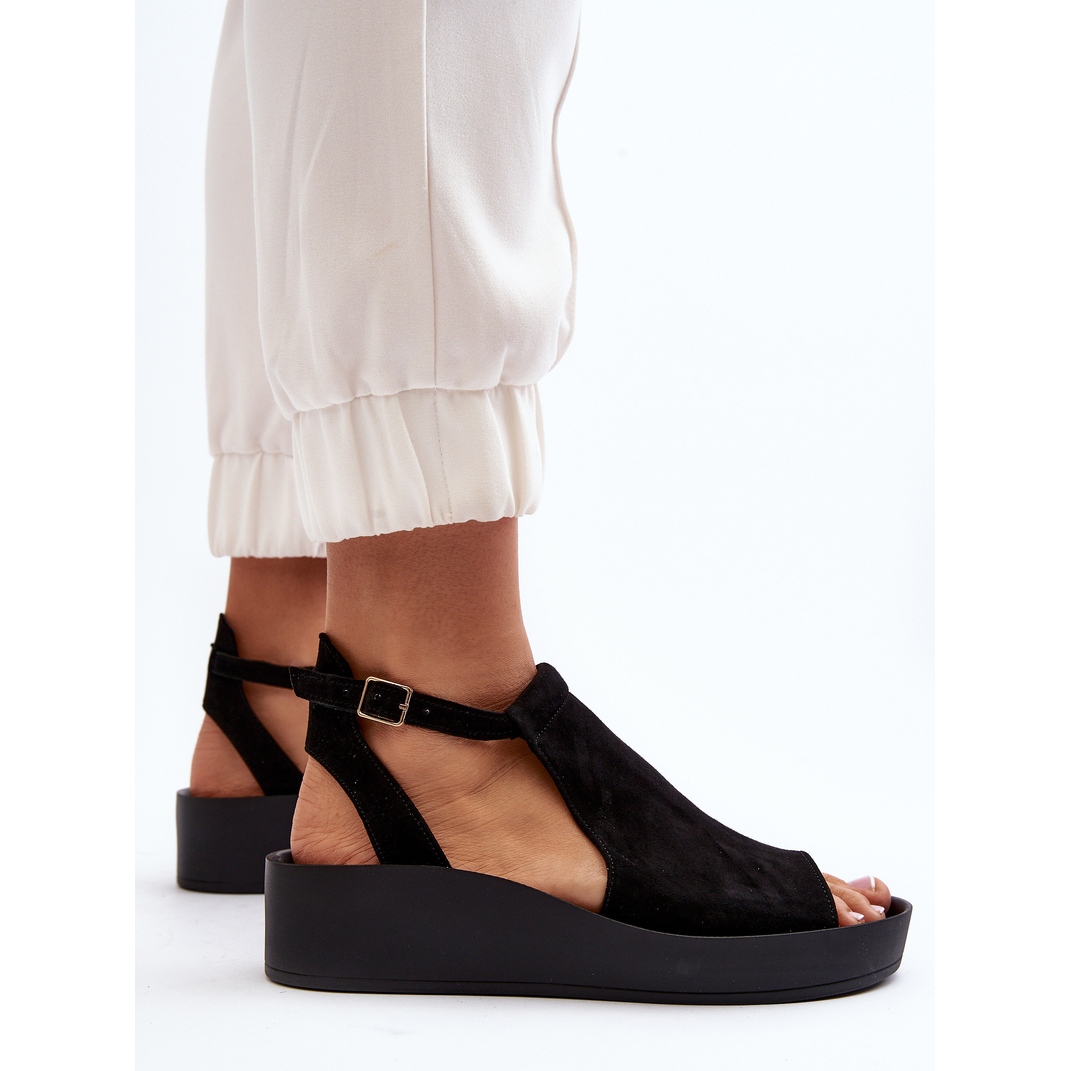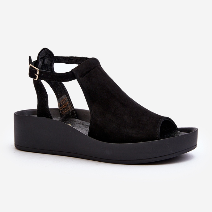 Ces sandales en daim noir présentent une coupe classique avec une tige qui assure confort et stabilité à chaque pas. Ces chaussures sont montées sur une plateforme délicate et une cale confortable de 4,5 cm de hauteur, ce qui constitue une solution idéale pour les personnes qui apprécient l'élégance combinée au confort. La plateforme et la semelle sont en plastique résistant, ce qui garantit la durabilité du produit.