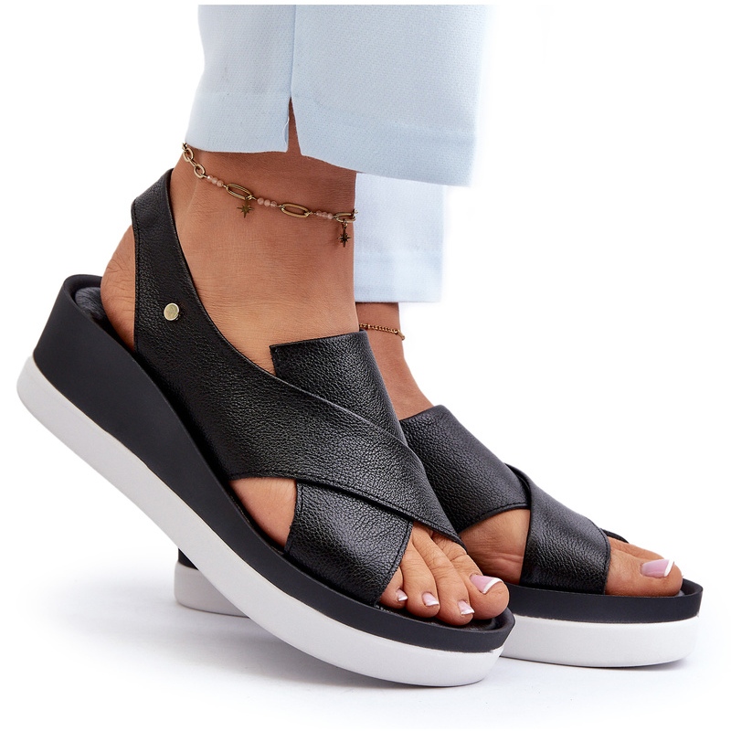 Le modèle coulissant, enrichi d'élastiques flexibles, s'adapte bien au tronçon de la jambe, garantissant un confort de port maximal. L'emblème décoratif placé sur le côté de la tige ajoute un caractère subtil aux sandales, ce qui fait exprimer chaque stylisation. Sites sur une plate-forme stable et des coins de 5,5 cm de haut, ces sandales sont à la fois élégantes et fonctionnelles.