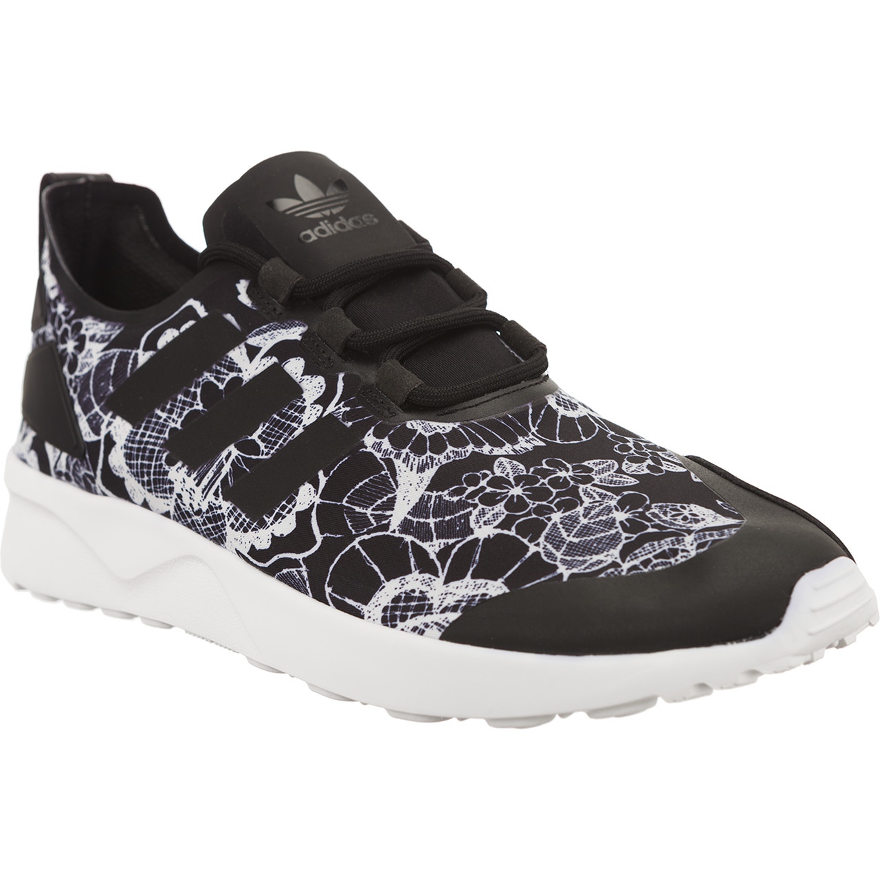 Résultat de la collaboration adidas x The FARM Company - le modèle ZX Flux ADV Verve combine la simplicité de la coupe emblématique ZX Flux avec un motif floral en dentelle distinctif qui distinguera n'importe quel style de tous les jours. La combinaison de couleurs sombres et élégantes Core Black/Core Black/White rend ces chaussures universelles et faciles à combiner.